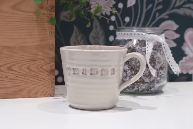 Unik keramikmugg med texten Mamma. Handgjord i Finland/Kustavii
