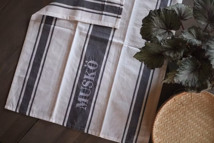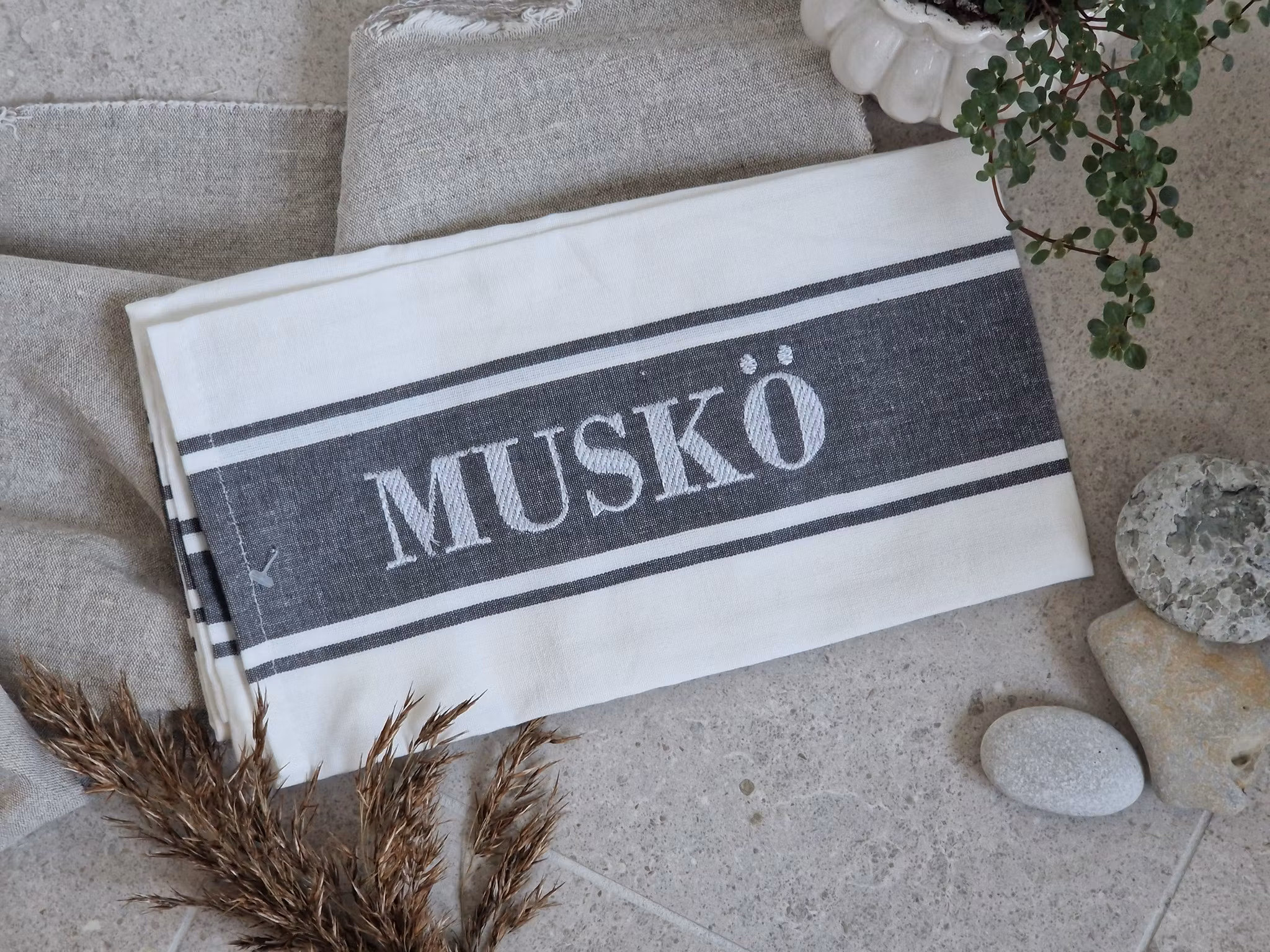 Musköhandduk - CT of Sweden I lager. Antal: 200 99 kr LÄGG I KORGEN Fin grå/vit kökshandduk med texten Muskö 45*60 cm