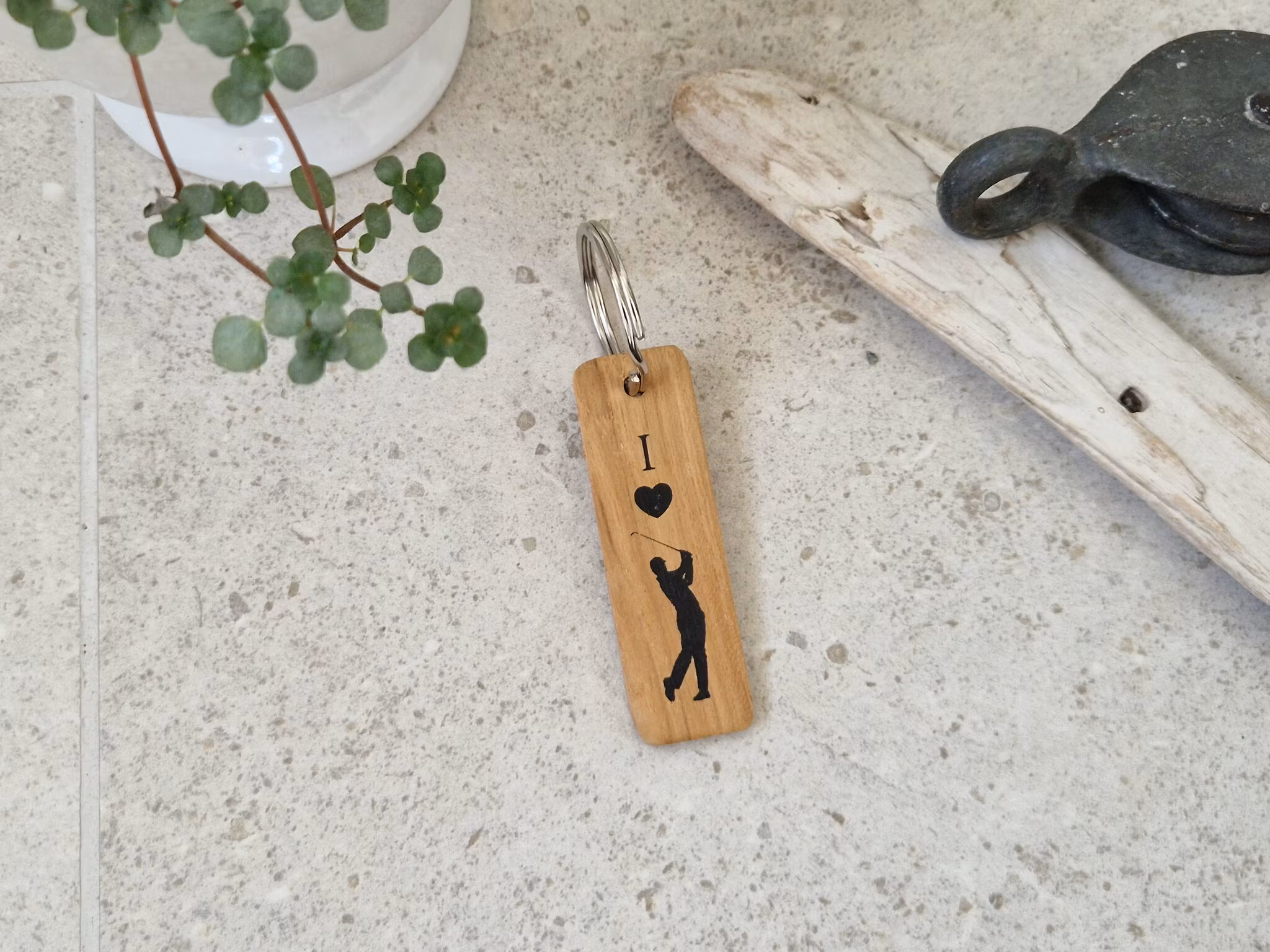 Nyckelring Golf - Different Design I lager. Antal: 2 30 kr LÄGG I KORGEN Brun nyckelring i teak med motiv av en golfspelare.Storlek 7x2 cm