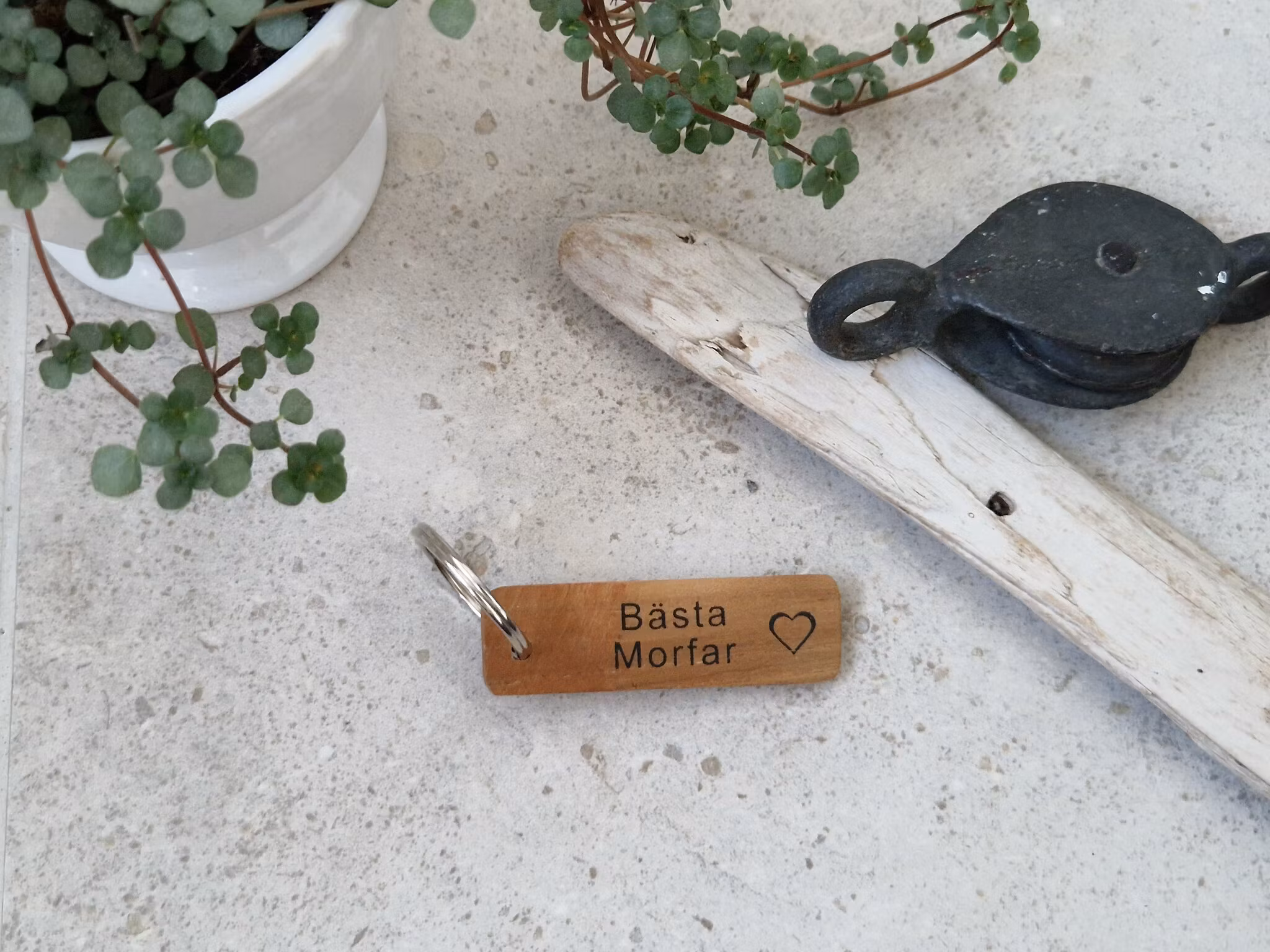 Nyckelring Morfar - Different Design I lager. Antal: 3 30 kr LÄGG I KORGEN Brun nyckelring i teak med texten Bästa Morfar.Storlek 7x2 cm